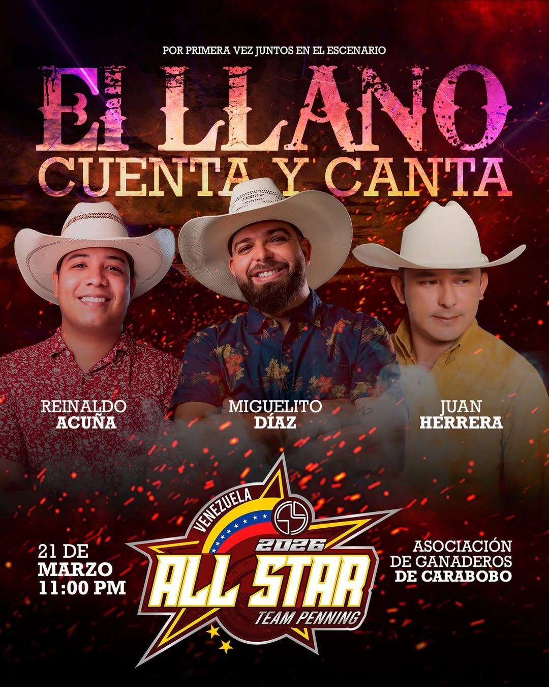 Este sábado 21 de marzo, Te invitamos a vivir la competencia y quedarte hasta la noche para disfrutar la música llanera en vivo. El plato fuerte es el concierto “Cuenta y Canta” con Miguelito Díaz, Reinaldo Acuña y Juan Herrera, a las 11 p.m. La competencia inicia desde las 9 am.