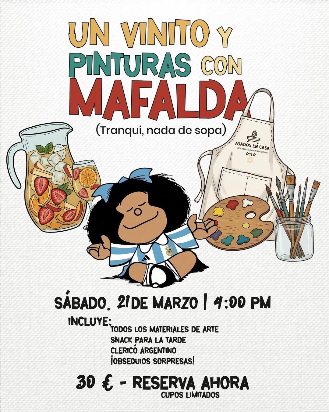 Una tarde para crear, brindar y disfrutar. Este sábado 21 de marzo a las 4:00 PM, @asadosencasa te invita a vivir una experiencia diferente: pintar tu propio delantal con la imagen de la queridísima Mafalda. Mientras dejas volar tu creatividad, vas a poder disfrutar de: