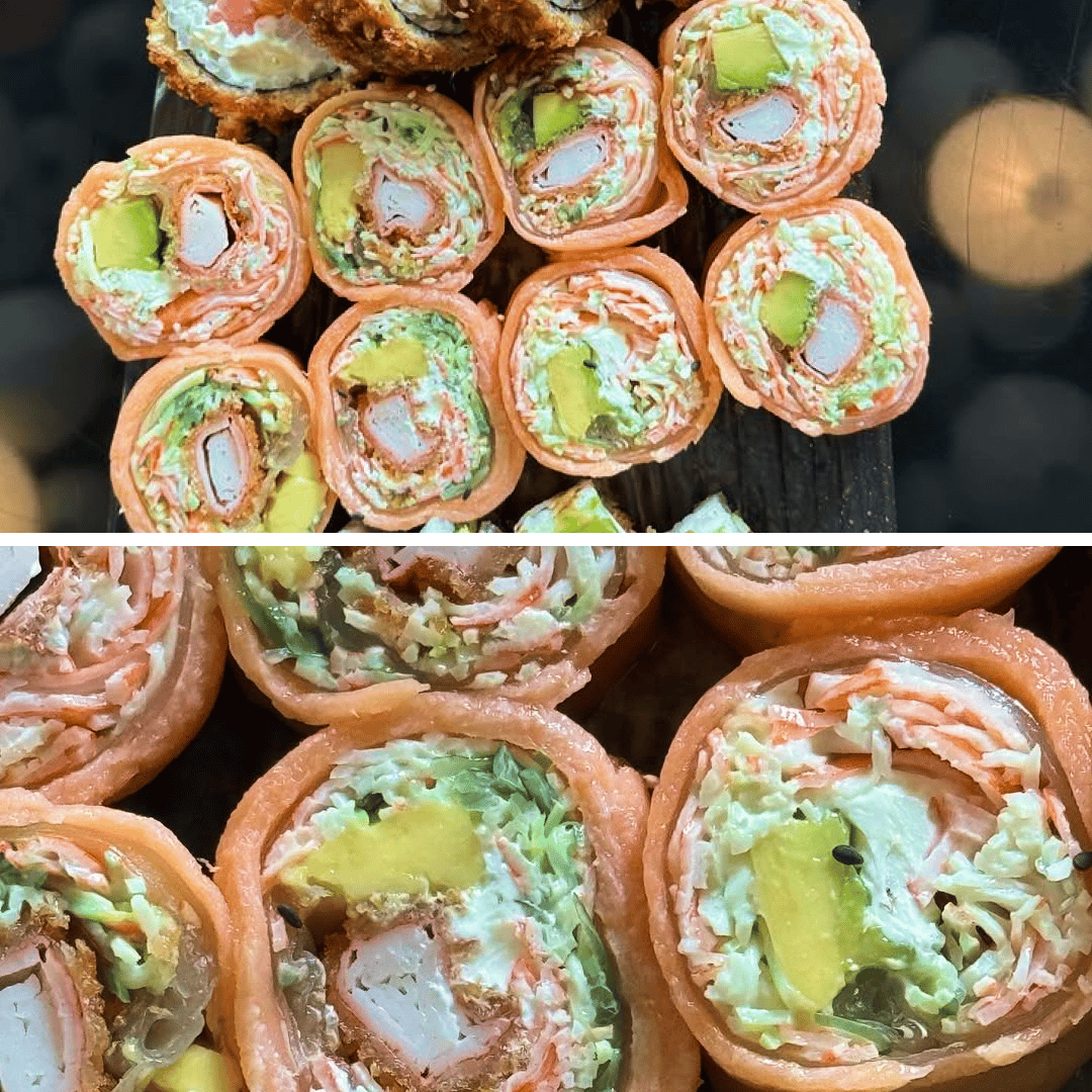 Si esta semana te provoca sushi, el Neptuno Sake de Kai Sushi Bar merece estar en el radar. Es un roll sin arroz, relleno de cangrejo tempurizado y queso crema, láminas de aguacate, ensalada Neptuno, cubierto con delicados cortes de salmón y un toque de reducción de parchita que levanta todos los sabores.