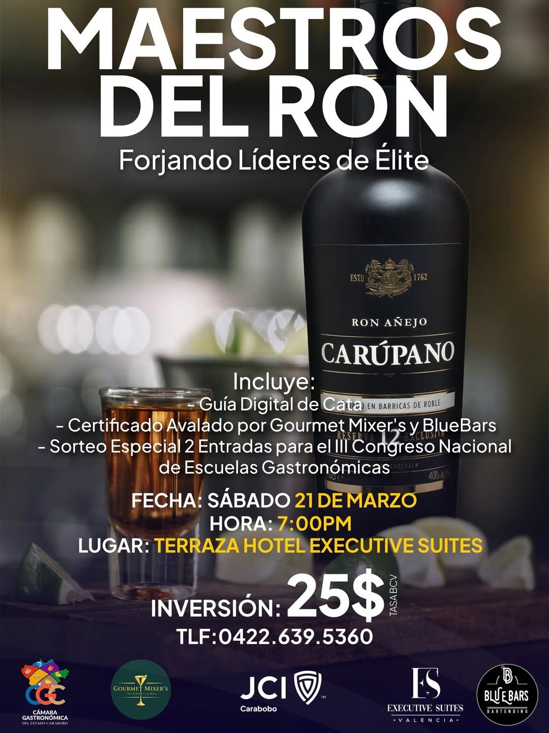Maestros del Ron propone una noche de cata y networking alrededor de Ron Carúpano, con la participación de Clovis Serni (@bluebarsoficial) y Andry Di Giovanni (@gourmetmixers). La experiencia incluye guía digital de cata, certificado avalado por Gourmet Mixer’s Blue Bars y un sorteo especial de 2 entradas para el III Congreso Nacional de Escuelas Gastronómicas.